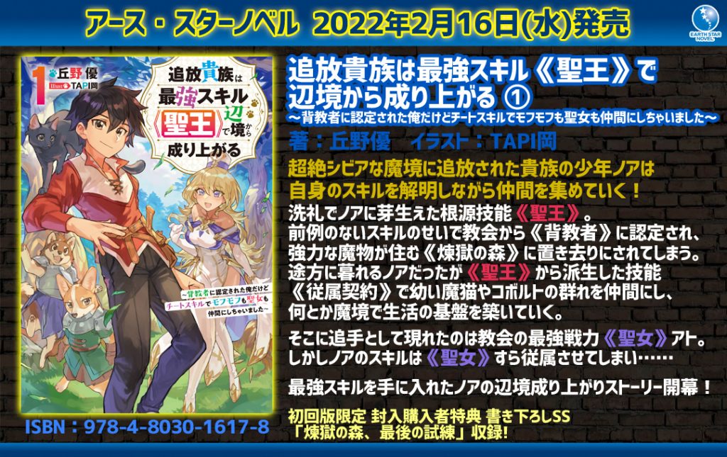 「追放貴族は最強スキル《聖王》で辺境から成り上がる ~背教者に認定された俺だけどチートスキルでモフモフも聖女も仲間にしちゃいました~」① ★特集ページ